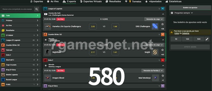 A aposta 580 oferece aos jogadores a experiência mais conveniente de apostas em eSports!